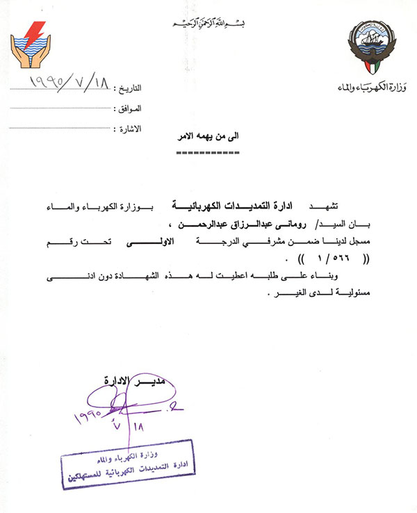 MEW (Kuwait) Registration (Supervisor First Class) No. 566/1 |