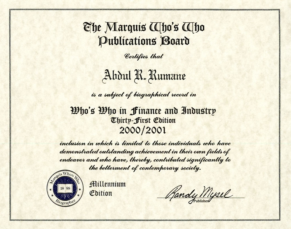 The inclusion in the Marquis publications is limited to those individuals who have demonstrated outstanding achievement in their own field of endeavour, and thereby contributing significantly to